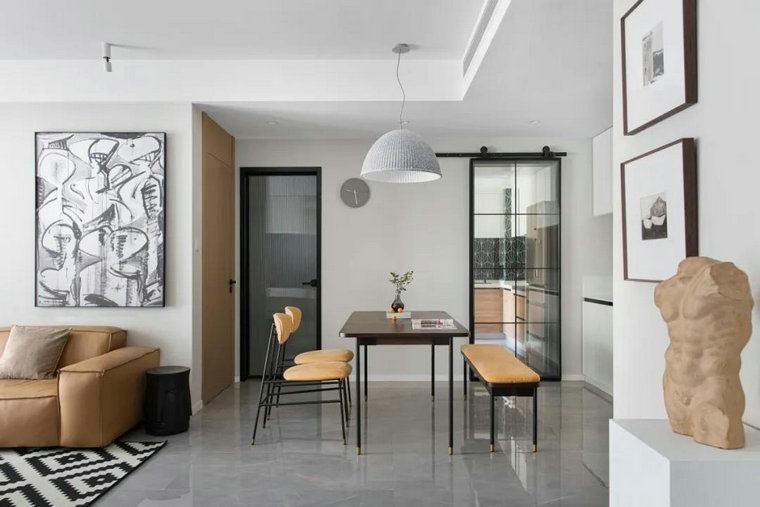 普佩斯淺灰大理石瓷磚貫穿客餐廚空間,雅致純粹的質(zhì)地鋪陳空間的層次感。簡(jiǎn)潔的餐廚空間布置呼應北歐風(fēng)格的生活美學(xué),冷暖色調的平衡營(yíng)造柔和舒適的空間秩序。