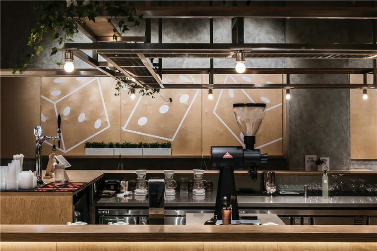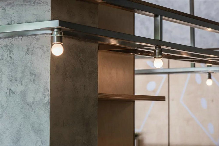 值得注意的是,吧臺上方是由不銹鋼支架去連結著(zhù)燈泡,縈紆在木質(zhì)橫梁和水泥墻面上,在細節處依舊貫徹工業(yè)風(fēng)的核心要義,同時(shí)在視覺(jué)上,形成了層次分明,錯落有致的效果,讓人眼前一亮。