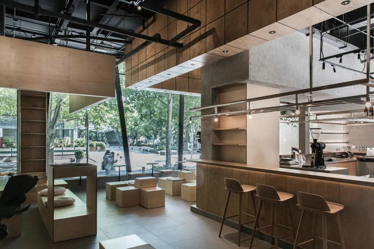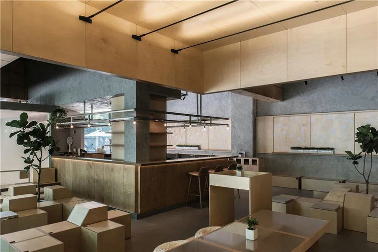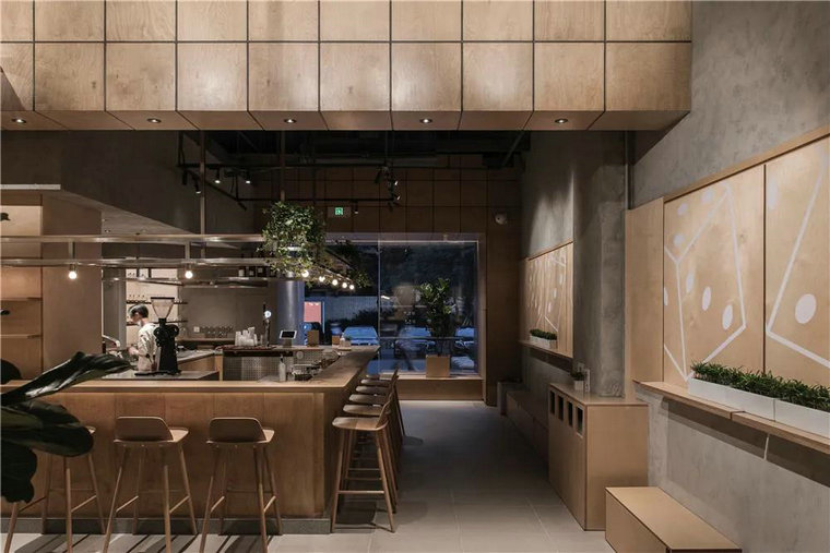 不難發(fā)現,在用餐區中,方形構成是室內的主元素,不管是方格模塊構成木質(zhì)橫梁面、可移動(dòng)的方盒子還是桌椅,都以不同的比例在空間內組合。而同樣也是方形的水泥質(zhì)感磚與其融合無(wú)間,提升了整體的格調,使人們好奇著(zhù)幾何圖形幻化為空間設計元素的巧妙構思。